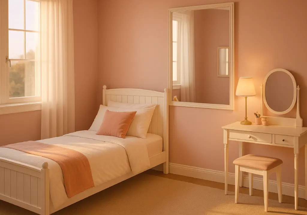 سرویس خواب دخترانه نوجوان شیک رنگ‌های سفید، صورتی، طوسی روشن ظریف، مدرن، دارای جزئیات لطیف دختران نوجوان