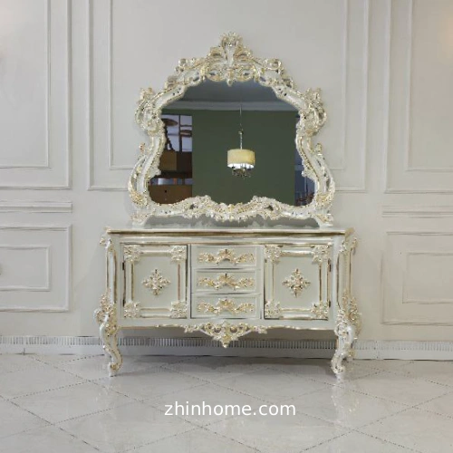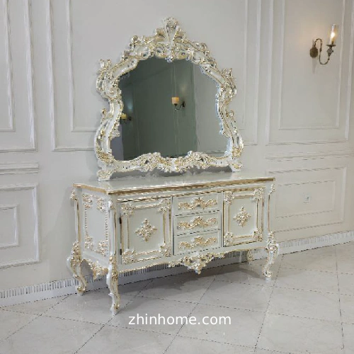 جنس بدنه و پایهها از چوب راش طبیعی بوده که با روکش راش مرغوب پوشیده شده و در عین استحکام، زیبایی خیرهکنندهای دارد. رنگ سفید براق با رگههای طلایی دستساز، در ترکیب با فرم منحنی پایهها و قاب آینه، محیطی لوکس و روشن پدید میآورد.